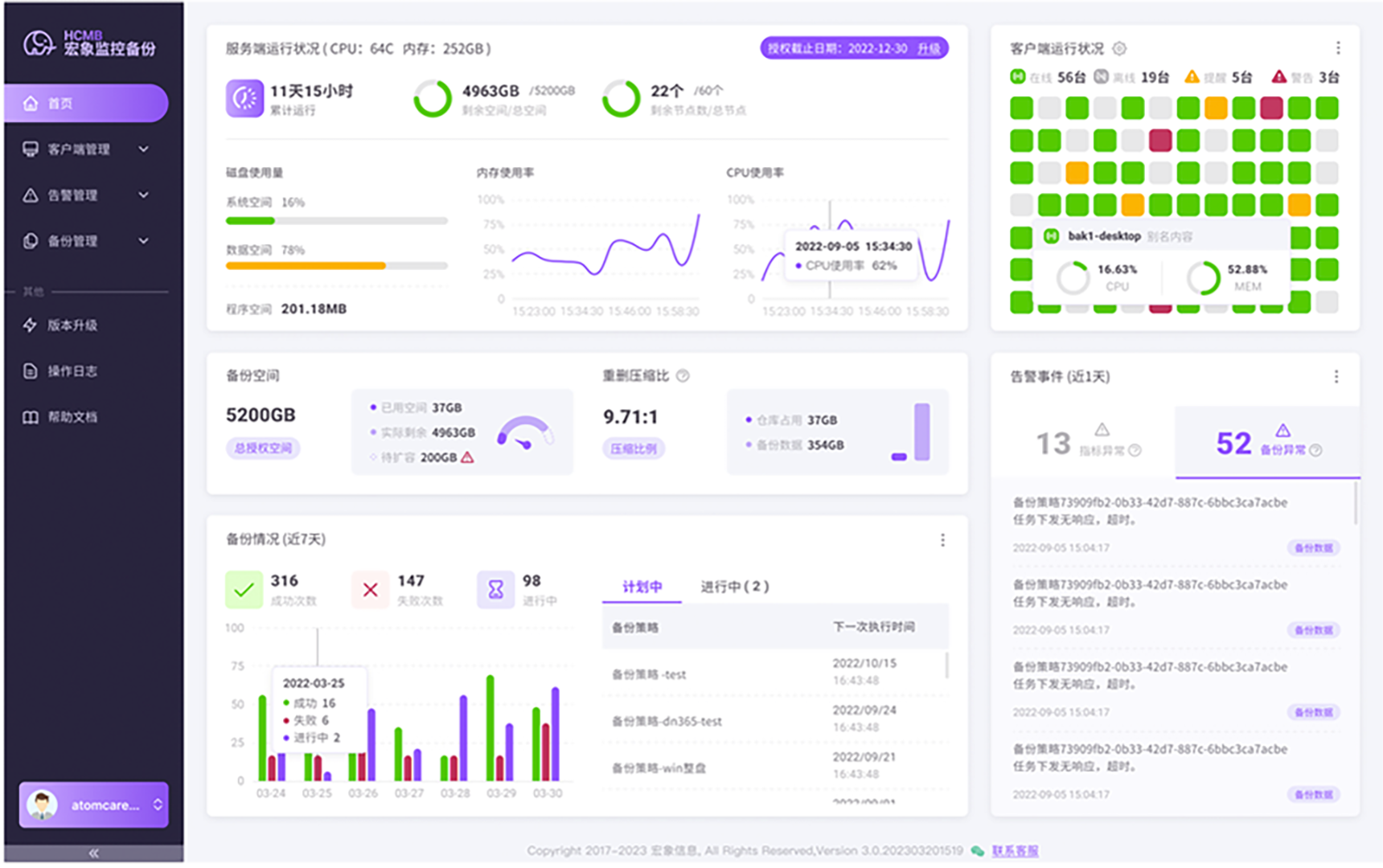 支持在服务端主机中集中化管理其下 各客户端的告警策略和备份策略